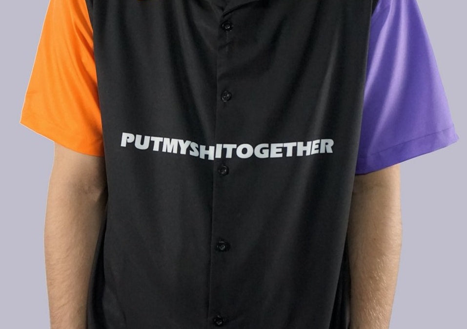 オレンジと紫の半袖、黄色の襟、背中に PMST メンタルヘルスの単語検索のデザインが付いている黒いボタン シャツ。