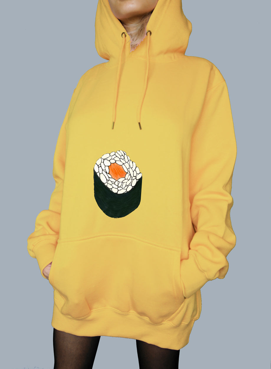 A kawaii pastel hoodie with a giant salmon Maki printed on the belly area for a full-on kawaii foodie look. Comes in pastel pink, daffodil yellow and grey.